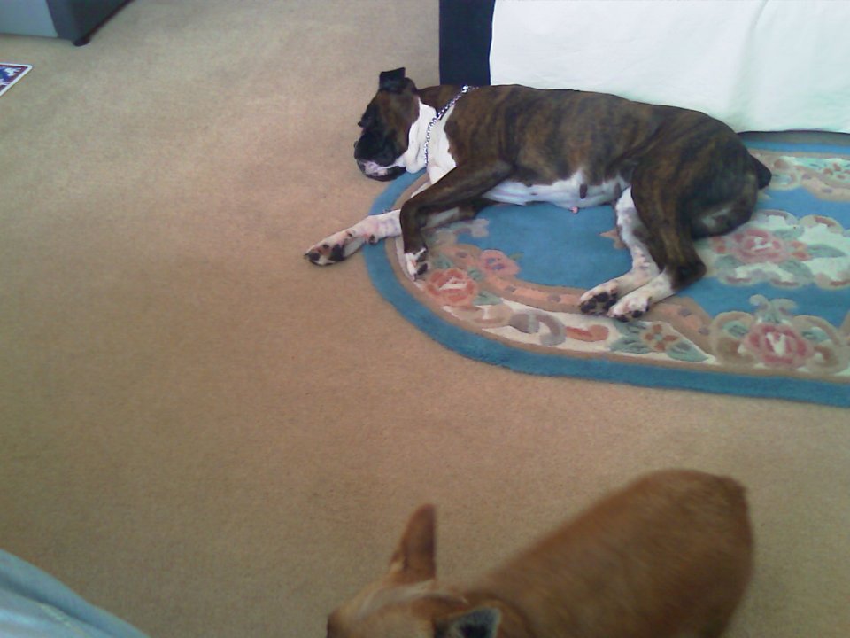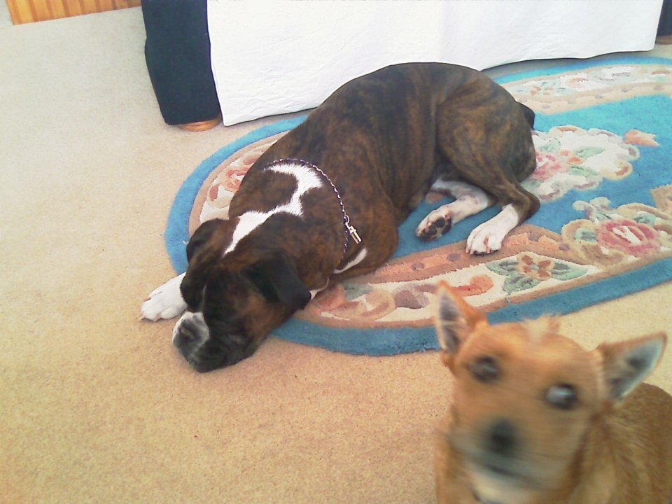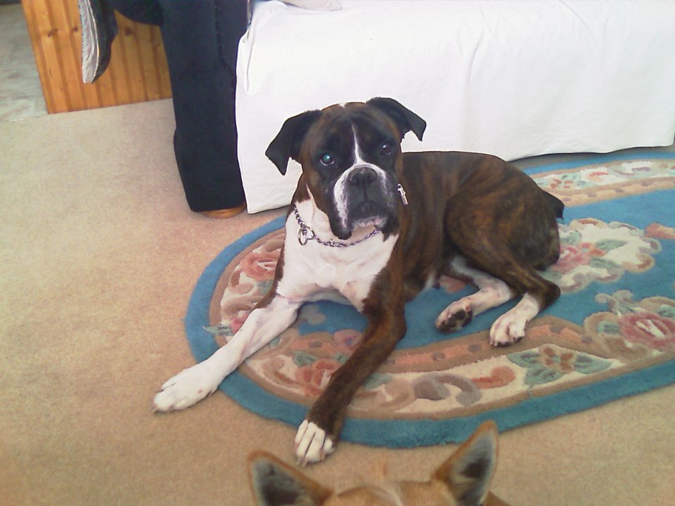This is Lilly, my very own Boxer. God she's LULLY! Check out Bella, trying to get into the action at the bottom of piccy!